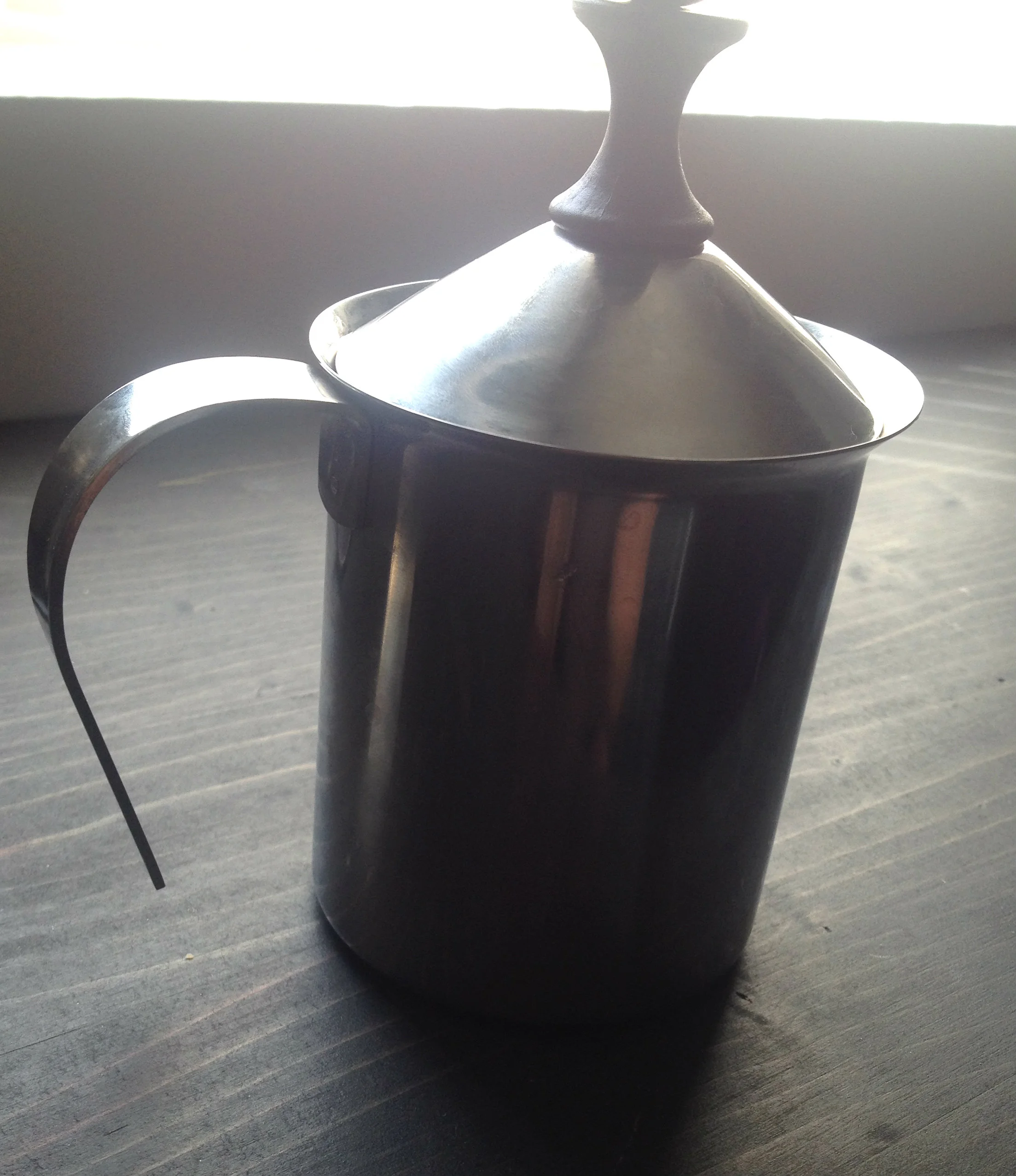 Next, pour the warmed milk into a frother. For this, you can use an electric one or a manual pump one, which you can pick up for a reasonable price at a home store or online. I ordered mine on Amazon Canada and received it within a couple days. This one's the perfect size for an individual latte.